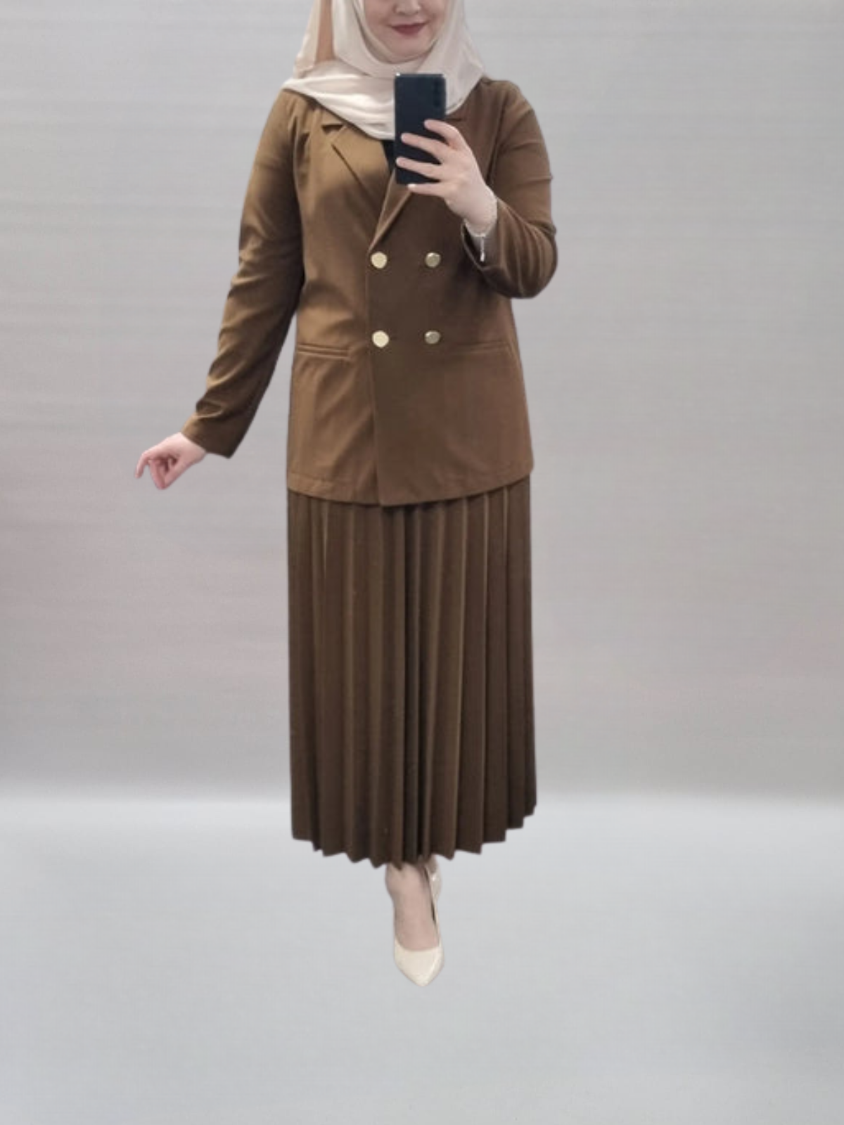 Dieses Set ist die perfekte Mischung aus klassisch und modern: Ein taillierter Blazer trifft auf einen fließenden Rock mit eleganten Plissee-Falten. Das Zusammenspiel aus Struktur und Bewegung verleiht dem Look eine edle, feminine Ausstrahlung.