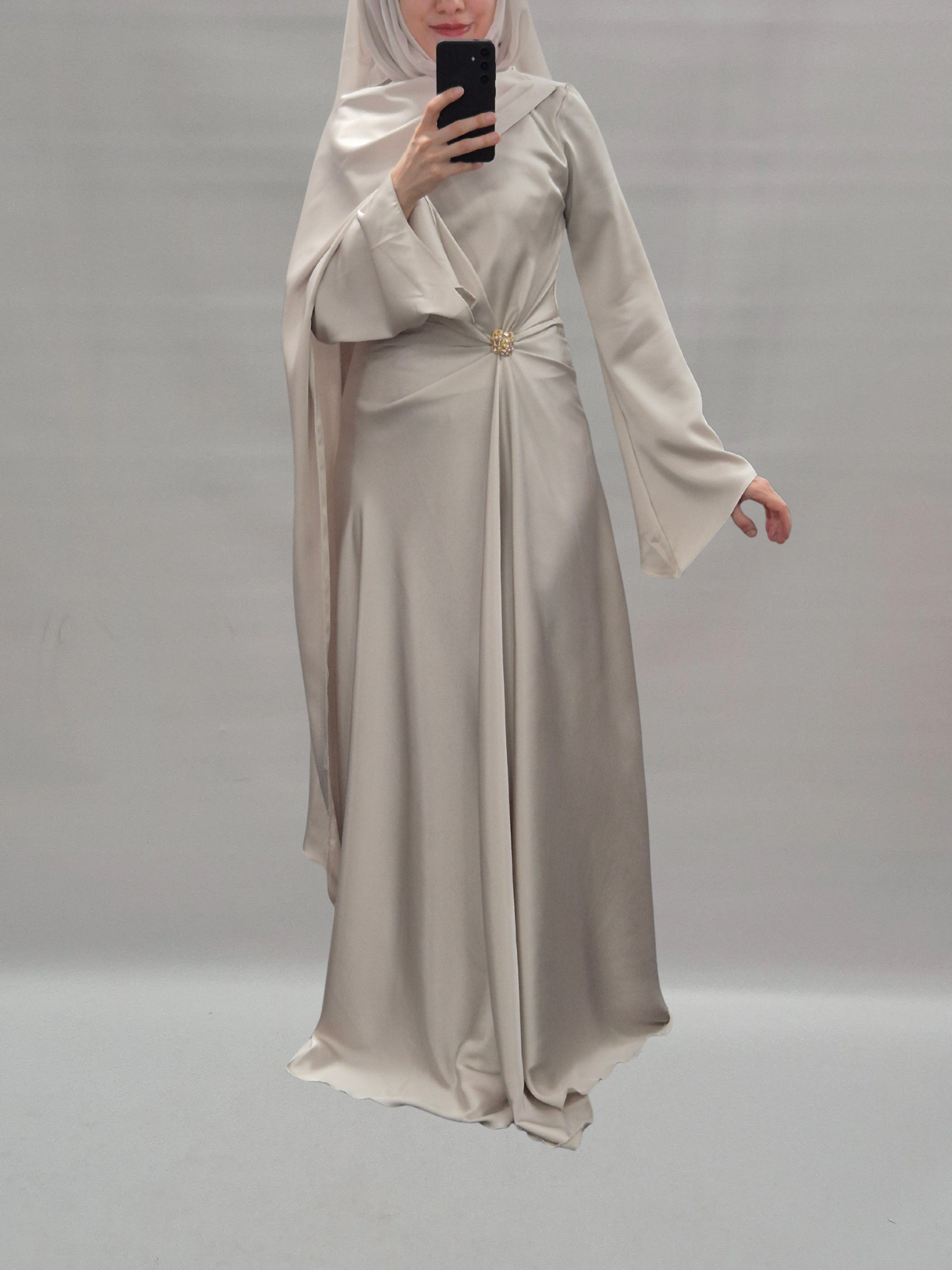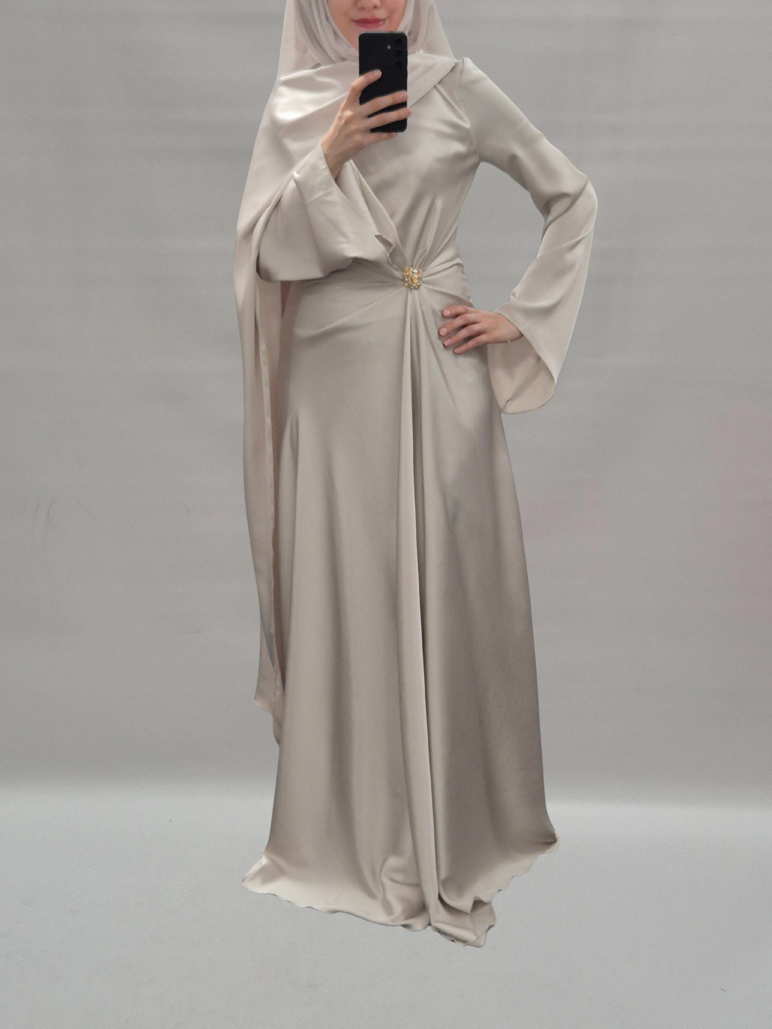 - Ein seitlich angesetzter,drapierter Stoffüberwurf