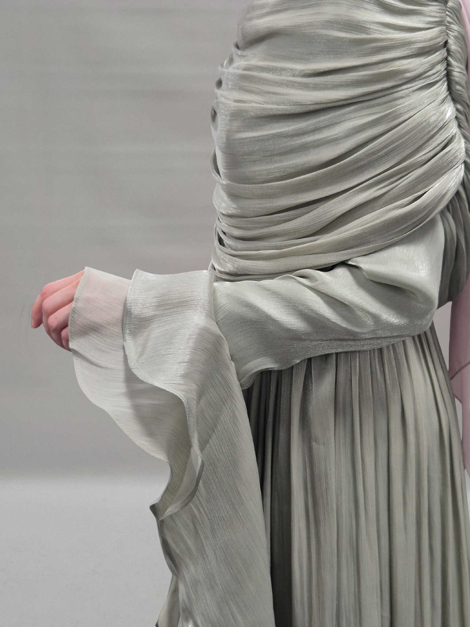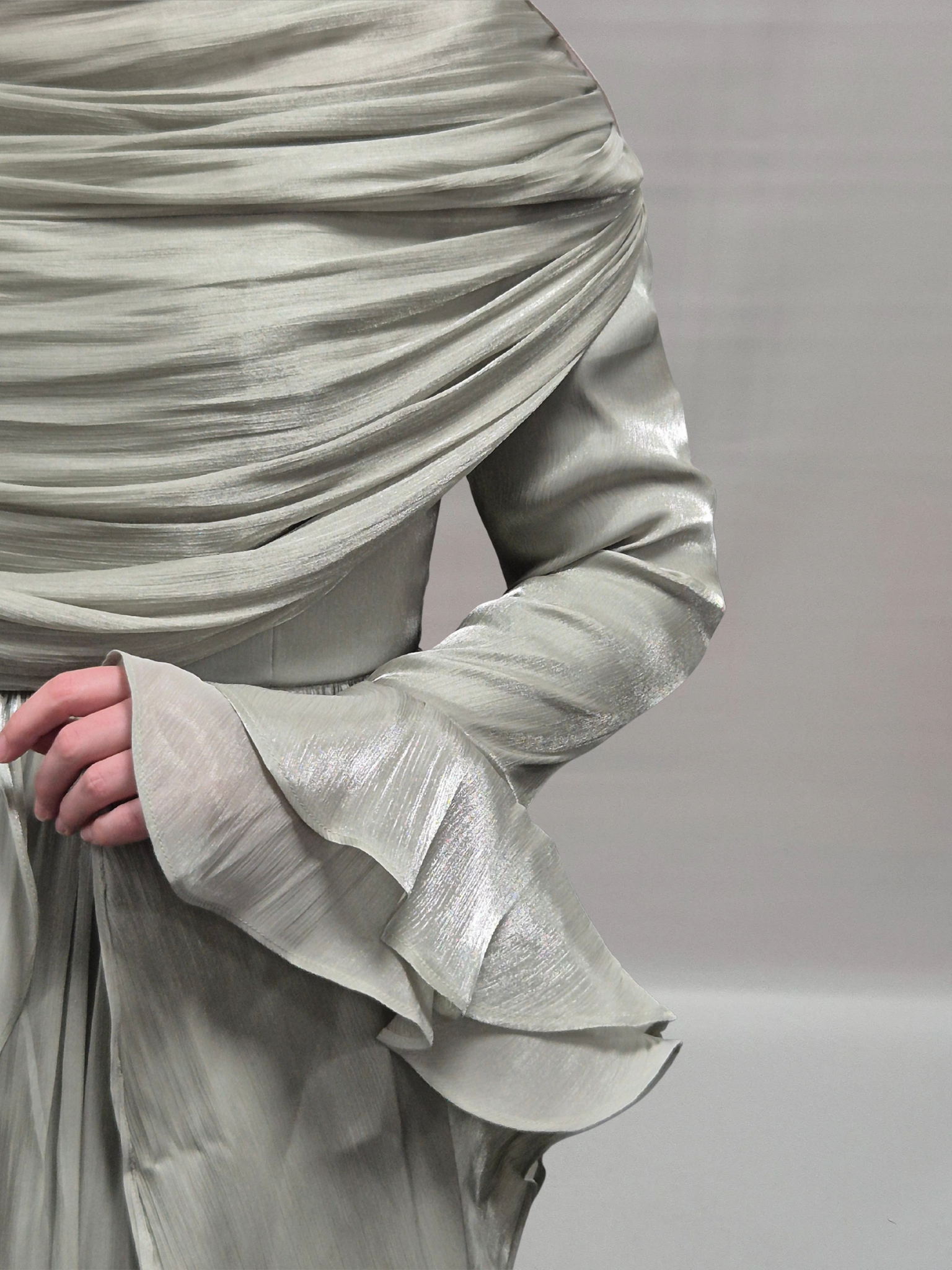 - Fließender, plissierter Rockteil mit mehreren asymmetrischen Rüschenlagen